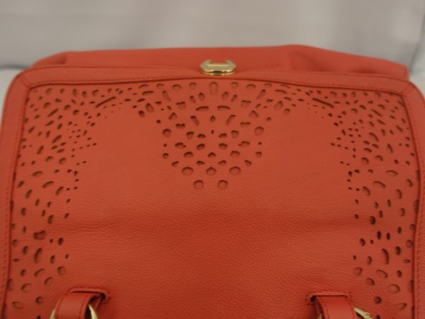 Diese Handtasche ist an der Vorderseite mit einem aufwendigen Lochmuster verziert.